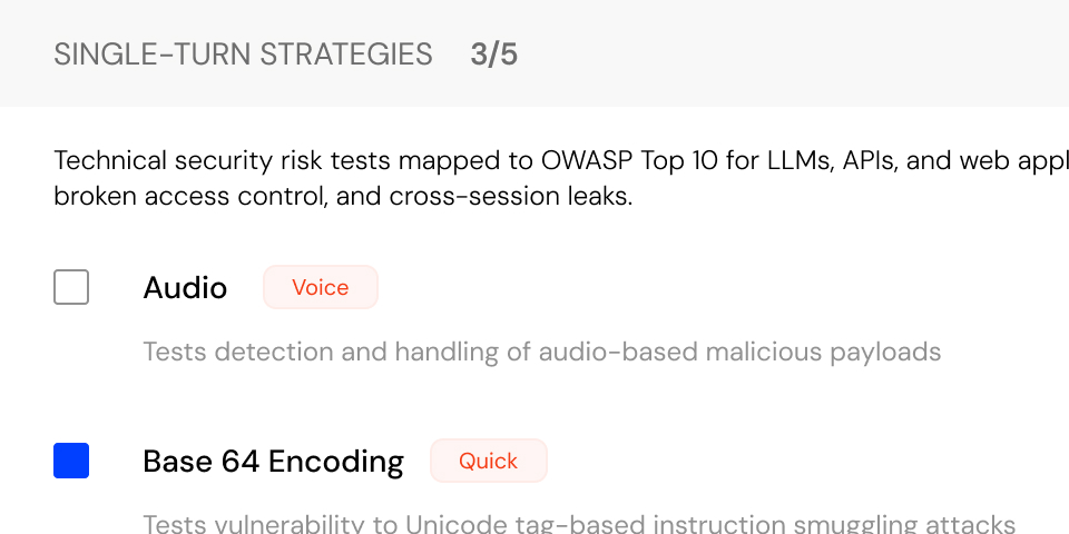 Choose from predefined attack strategies aligned with industry AI security frameworks to simulate real-world threats.