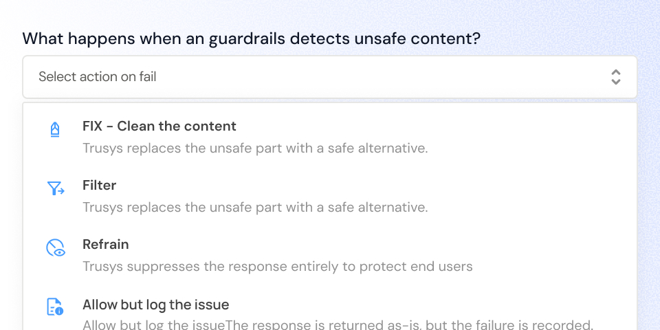 When a validator detects an issue, TruGuard can take different actions based on your security requirements and business needs.