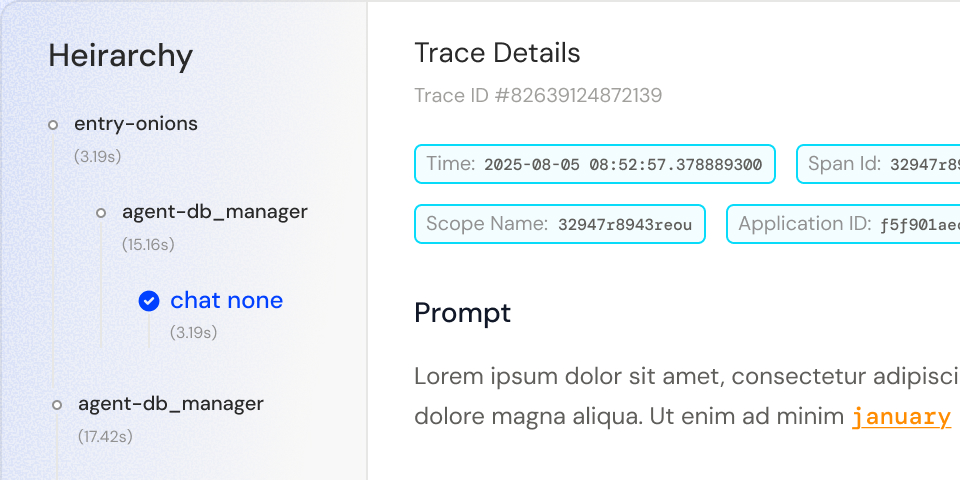 Detailed step-by-step visibility into every AI interaction, including inputs, outputs, model calls, and intermediate steps for faster debugging and deeper analysis.